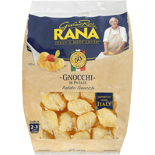 Rana™ Potato Gnocchi. Giovanni Rana. Italy's Most Loved™*. Master pasta maker Verona, Italia. Over 50 years. Gnocchi-DI patate. Imported from Italy. Cooks in 2-3 min. Net wt 17.6 oz (500g).