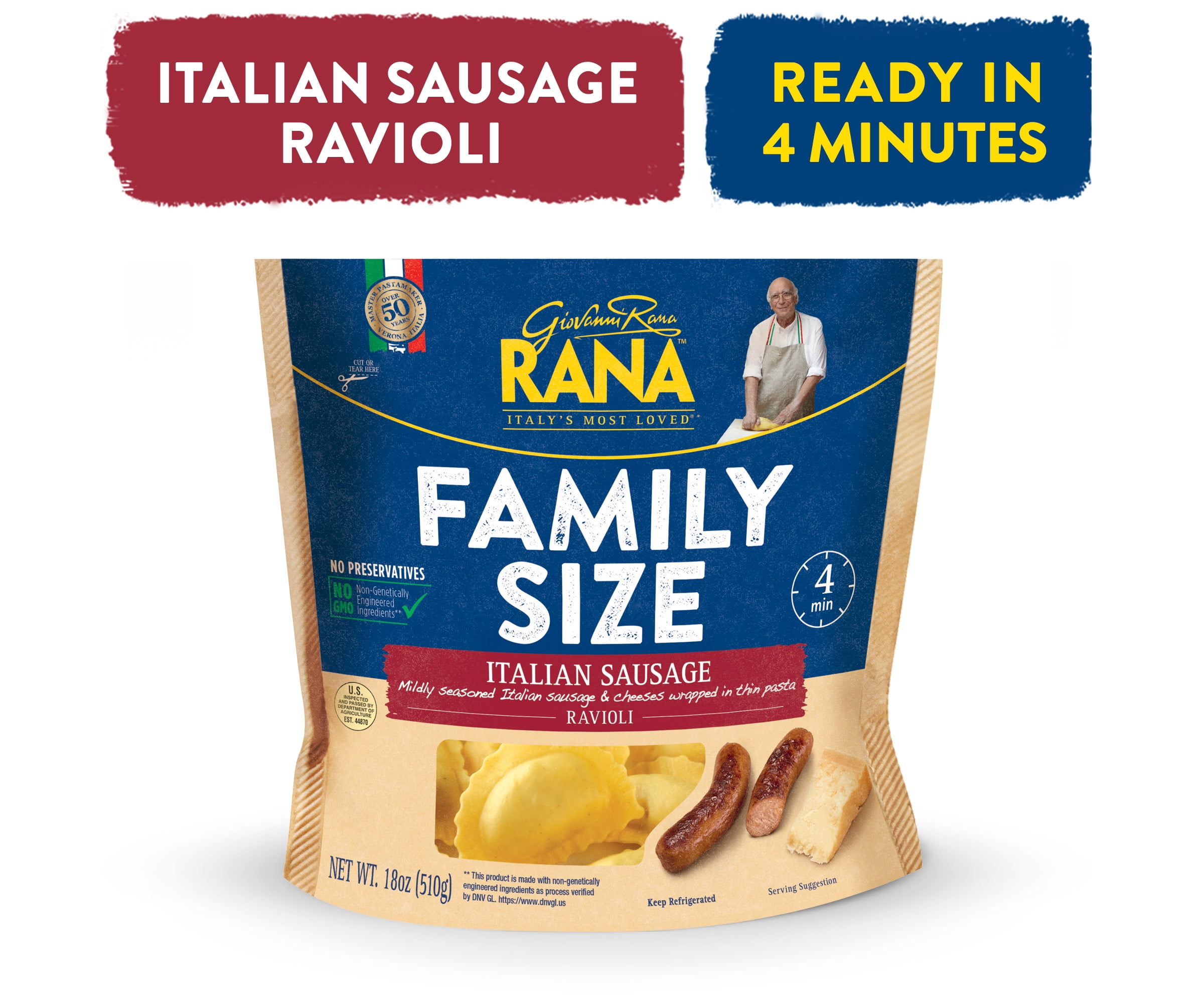 Experience Giovanni Rana's Family-Sized Italian Sausage Ravioli, a premium pasta. With over 60 years of tradition and American production since 2012, we offer top-quality, non-GMO products. Many ingredients carry D.O.P. certification, ensuring authenticity. Our goal is to provide the best pasta and entrées. The ravioli's rich golden hue, from a higher egg content, along with quality fillings and quick cooking thin pasta, enhances every bite. Free from preservatives, artificial colors, powdered eggs, gums, hydrogenated fats, and GMOs, it showcases Rana's commitment to premium, authentic ingredients. Regular. Refrigerated.