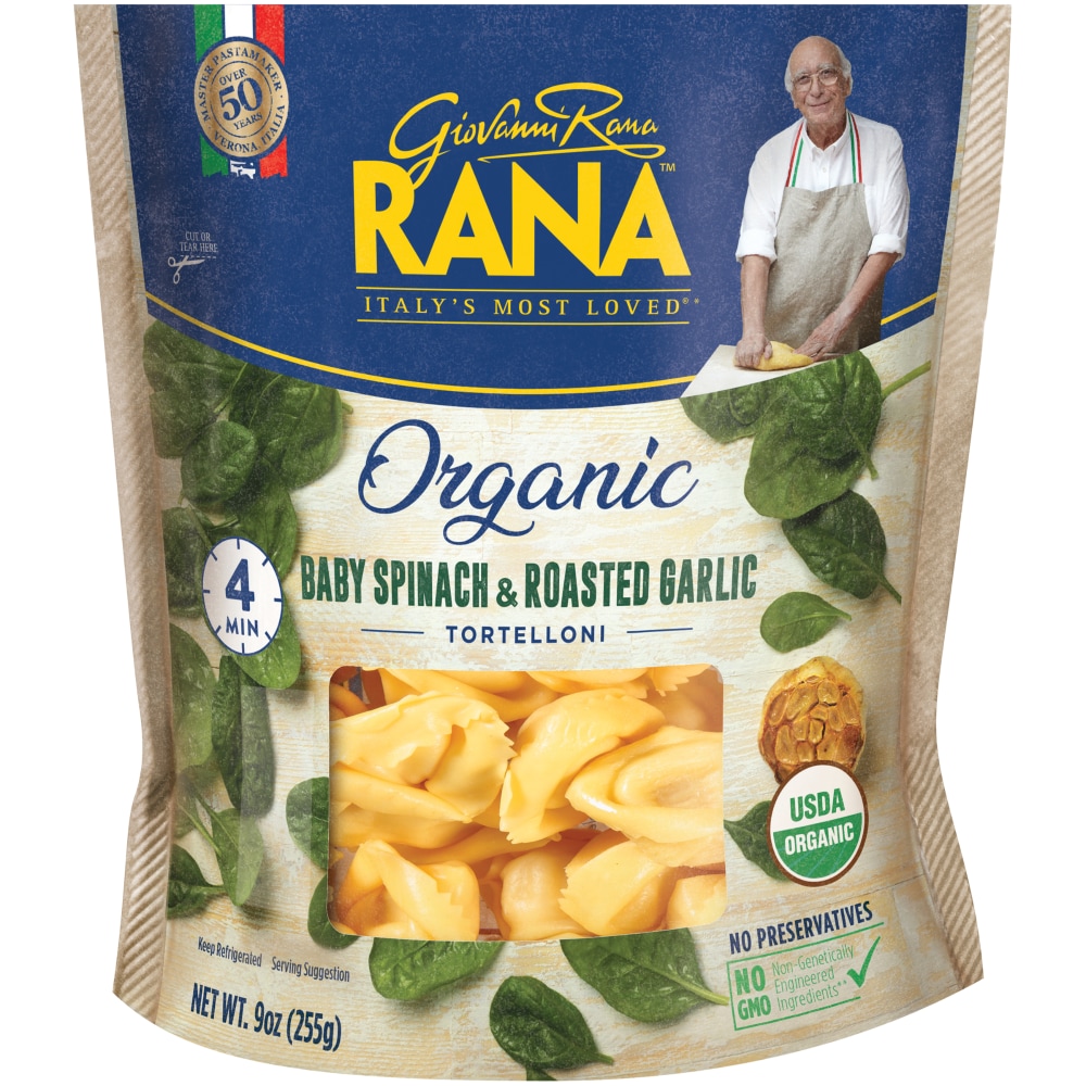 ● Rana Tortelloni, Baby Spinach and Roasted Garlic. ● Organic Pasta. Rana Organic Baby Spinach and Roasted Garlic Tortelloni brings the flavors of Italy to your table. Ready to eat in 4 minutes, Rana Organic Baby Spinach and Roasted Garlic Tortelloni are clouds of delicate pasta filled with ricotta cheese, spinach and slow-roasted garlic. Rana Organic Baby Spinach and Roasted Garlic Tortelloni tastes great with a simple drizzle of olive oil and sprinkle of parmesan or can be added to any recipe for extra flavor.