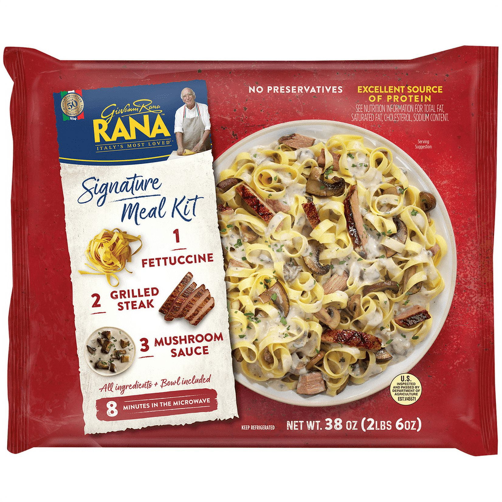 1. Fettuccine; 2. Grilled steak; 3. Mushroom sauce. No artificial flavors. Excellent source of protein. See nutrition for total fat, saturated fat, cholesterol, sodium content. Over 50 years - Master pasta maker, Verona, Italia. Italy's most loved (based on refrigerated pasta sales). No preservatives. All ingredients + bowl included. 8 minutes in the microwave.