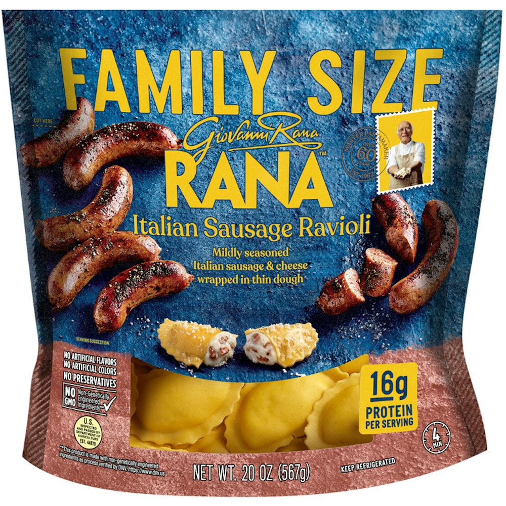 Stuffed Italian sausage ravioli in a family size pack. Expertly crafted with no preservatives Rana(tm) Italian sausage Ravioli offers the authentic flavor and texture your customers look for in filled ravioli pasta. Each tender ravioli pillow is filled with mildly seasoned Italian sausage and a generous portion of cheese to deliver an authentic taste of Italy. The branded pouches are familiar to shoppers and health-benefit callouts make this stuffed pasta an ideal choice for your ready-fix meals.