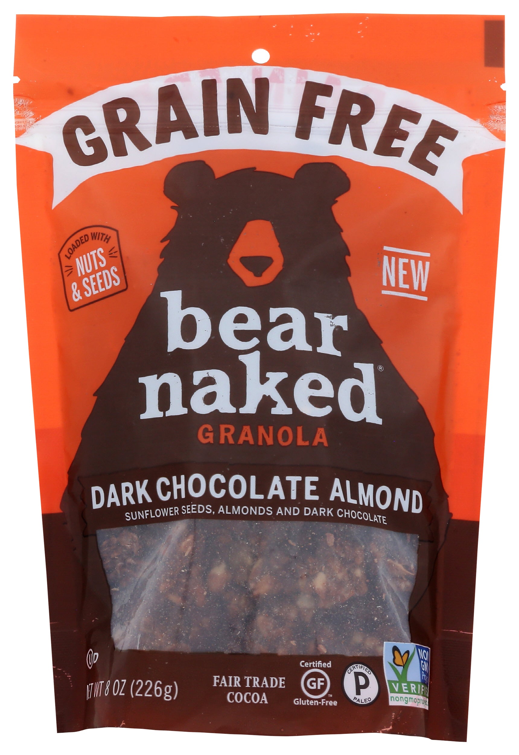 Bear Naked Dark Chocolate Almond Granola. When you think granola, you think grains - but what if we told you we made Grain Free granola? That's right! We've taken all the deliciousness of Bear Naked, nixed the grains, and created a base loaded with lots and lots of Nuts and Seeds. We may not have literally foraged for it, but it's Paleo-friendly, gluten-free, and filled with the perfect blend of fair trade dark chocolate, almonds, sunflower seeds, and pumpkin seeds. Simple ingredients create hearty grain-free granola that you'll crave.