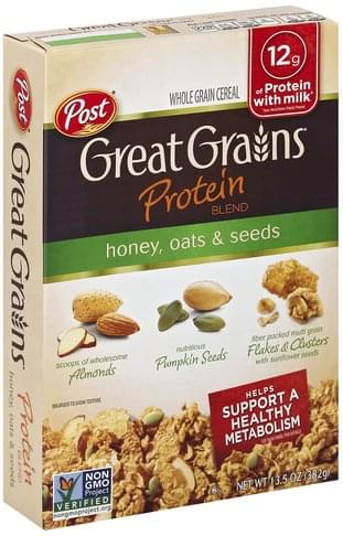 - The product category for Post, Great Grains, Whole Grain Cereal, Honey,Oats & Seeds, Honey,Oats & Seeds is Cereal & Granola.
