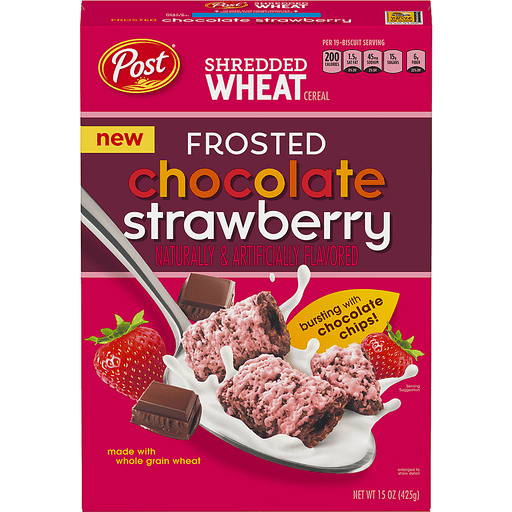 A tasty twist on the original. Kick off your day with new Post Shredded Wheat Frosted Chocolate Strawberry cereal! The wholesomeness of shredded wheat biscuits combined with delicious strawberry flavored frosting and a burst of chocolate goodness in the middle.