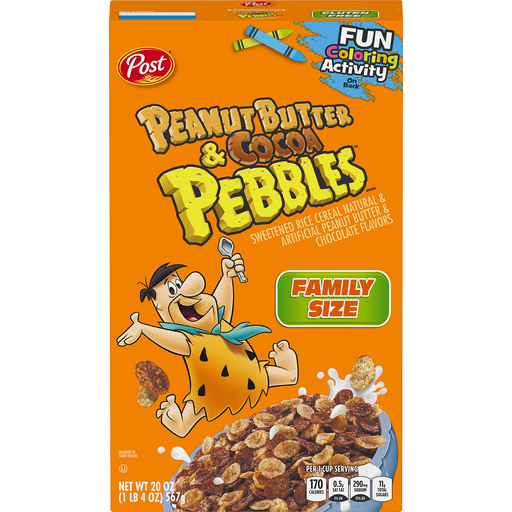 DescripciónPost Peanut Butter & Cocoa Pebbles Cereal (20 oz. Box).