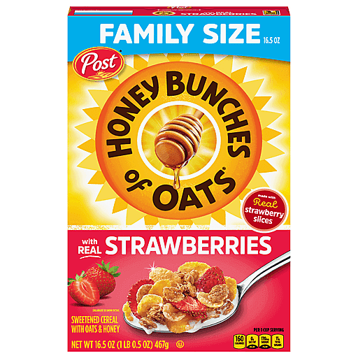 One 16.5 oz box of Honey Bunches of Oats with Strawberries Breakfast Cereal, Honey Oats and Strawberry Cereal. Help start your mornings feeling energized and enjoy this honey cereal filled with crispy corn flakes, granola clusters and real strawberry slices. This honey cereal contains 12 grams of whole grains per serving and 6 essential vitamins and minerals to help start your day with energy. Post Honey Bunches of Oats cereal is chock full of crunchy goodness and delivers a touch of sweetness to your morning breakfast cereal. Add bits of Post Honey Bunches of Oats dry cereal snacks to cereal breakfast treat bars, a breakfast smoothie or yogurt cup for even more exciting flavor and crunch.