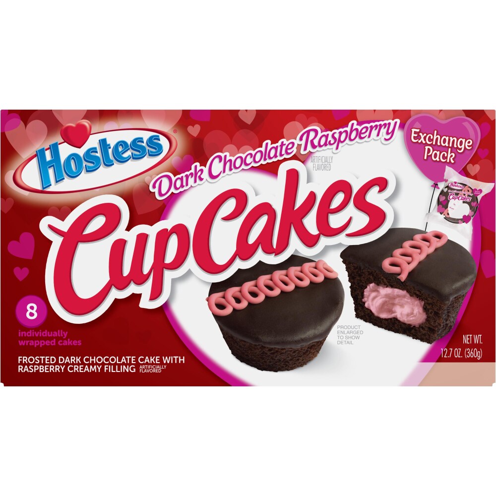 Hostess® CupCakes Dark Chocolate Raspberry. Limited edition. The original squiggle®. Individually wrapped cakes. Frosted Dark Chocolate cake with artificially flavored raspberry creamy filling. Net Wt. 12.7 oz. (360 g). Recyclable. Hostess quality commitment. At Hostess we care deeply about our customers and are committed to providing you with quality bakery products. We welcome your Comments and Questions. Call: 1-800-483-7253. Visit: www.hostesscakes.com.
