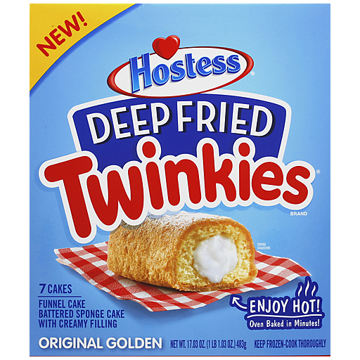 New! Funnel cake battered sponge cake with creamy filling. Enjoy hot. Oven baked in minutes! The fun of a State Fair right our of your oven! Real Hostess Twinkies Fried with Funnel Cake batter! Partially produced with genetic engineering.