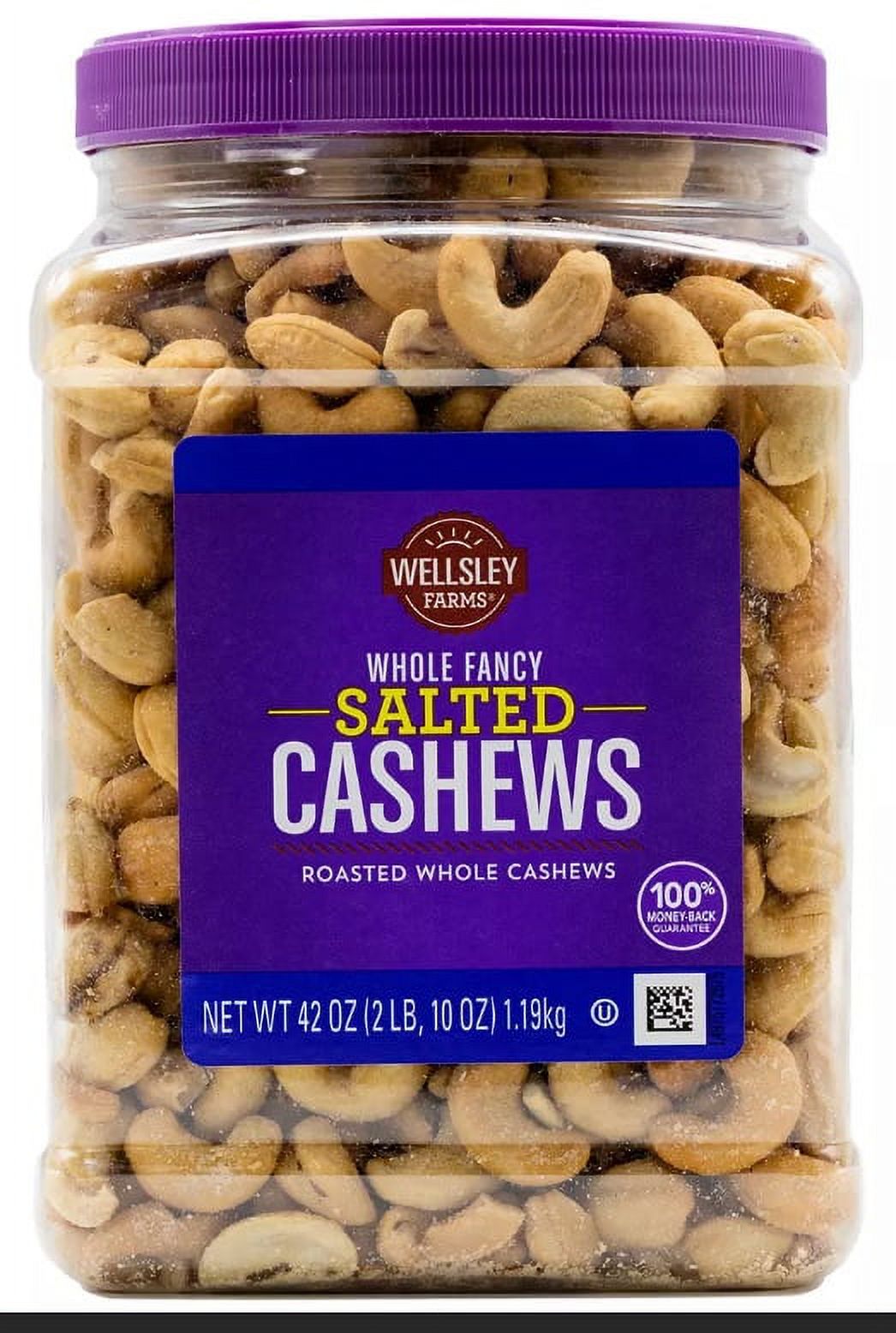 Made in USA BJ’s WOW Factor. Your favorite salty cashew snack comes in a container that perfect for sharing with the whole family or storing in your office snack drawer. Wellsley Farms Whole Fancy Salted Roasted Whole Cashews are a great for eating on the go or when you're in need of a handful of a healthy snack. Featuring a roasted and salted taste, they're delicious, too. These salted whole cashews also come packed inside a 42-oz. PET jar for easy storage.