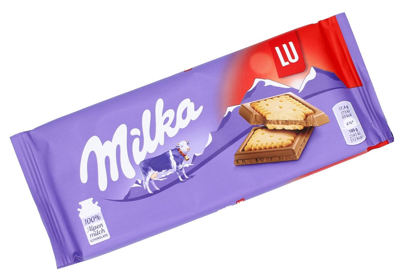 Milk chocolate and French Lu biscuits. Made with 100 percent Alpine milk. Attractive wrapper. Unique in form and delicious in taste, the Milka Lu Cookie Bar is an intriguing snack option that's sure to catch the eyes of your patrons. Mika frames crispy French Lu biscuits with its famed milk chocolate. The result is a sweet satisfying snack that's beautiful to behold. And it comes in a resealable package so customers can eat some now and save the rest for later.