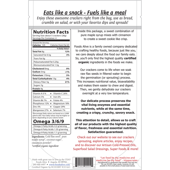 - The manufacturer of Flax Snackers, Maple Cinnamon is Foods Alive.