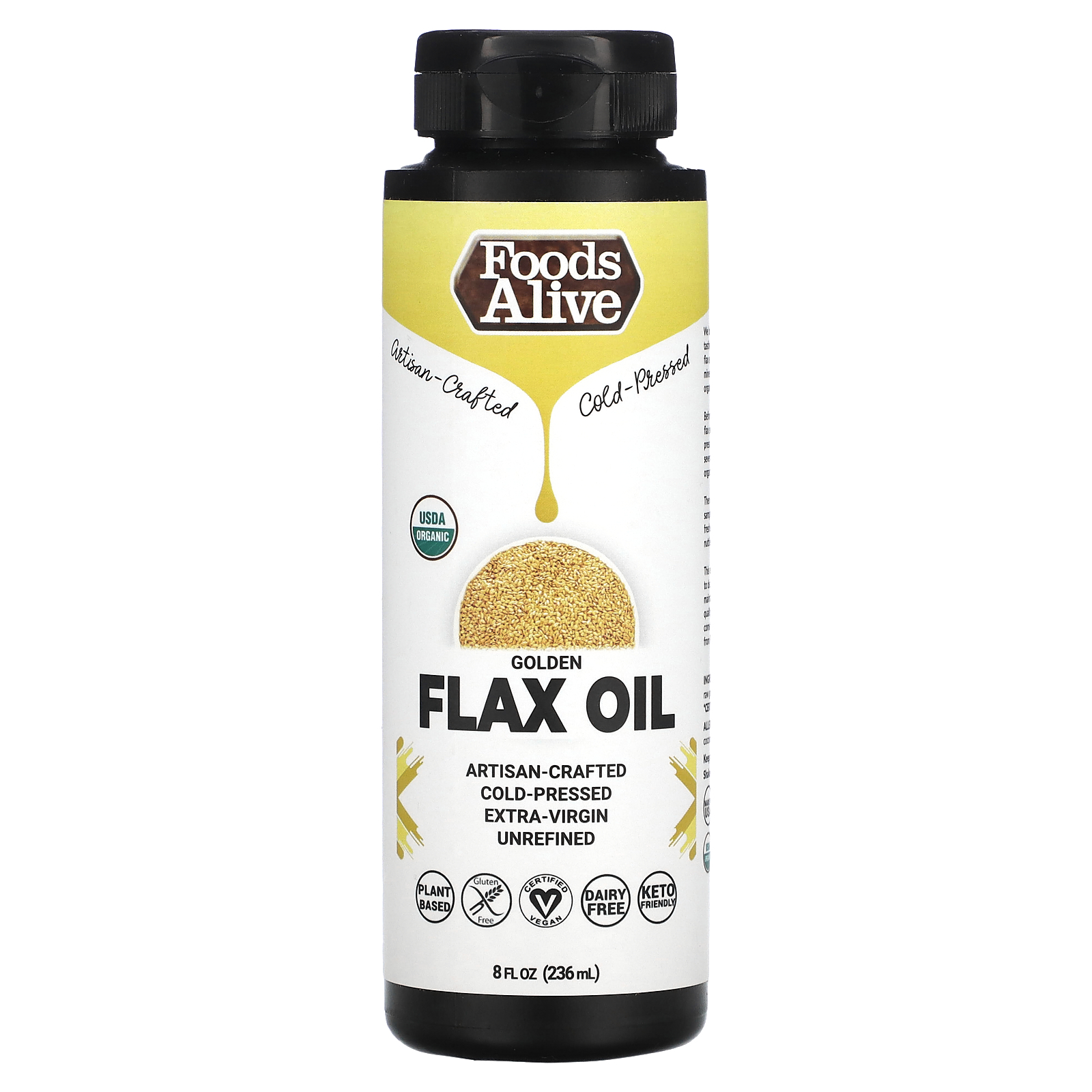 Gold Flax Seed Oil Organic 8 fl oz Artisan Cold-Pressed We believe the freshest and best tasting flaxseed grows in the most nutrient dense & mineral rich soil. We Artisan press samples from several certified organic farmers. Then taste each batch to find the one with the lightest and nuttiest taste, showing its full potential of essential minerals and nutrients. The perfect addition to smoothies, shakes and salad dressings or bring it to the table and add it to a bowl of soup, rice, pasta and more!