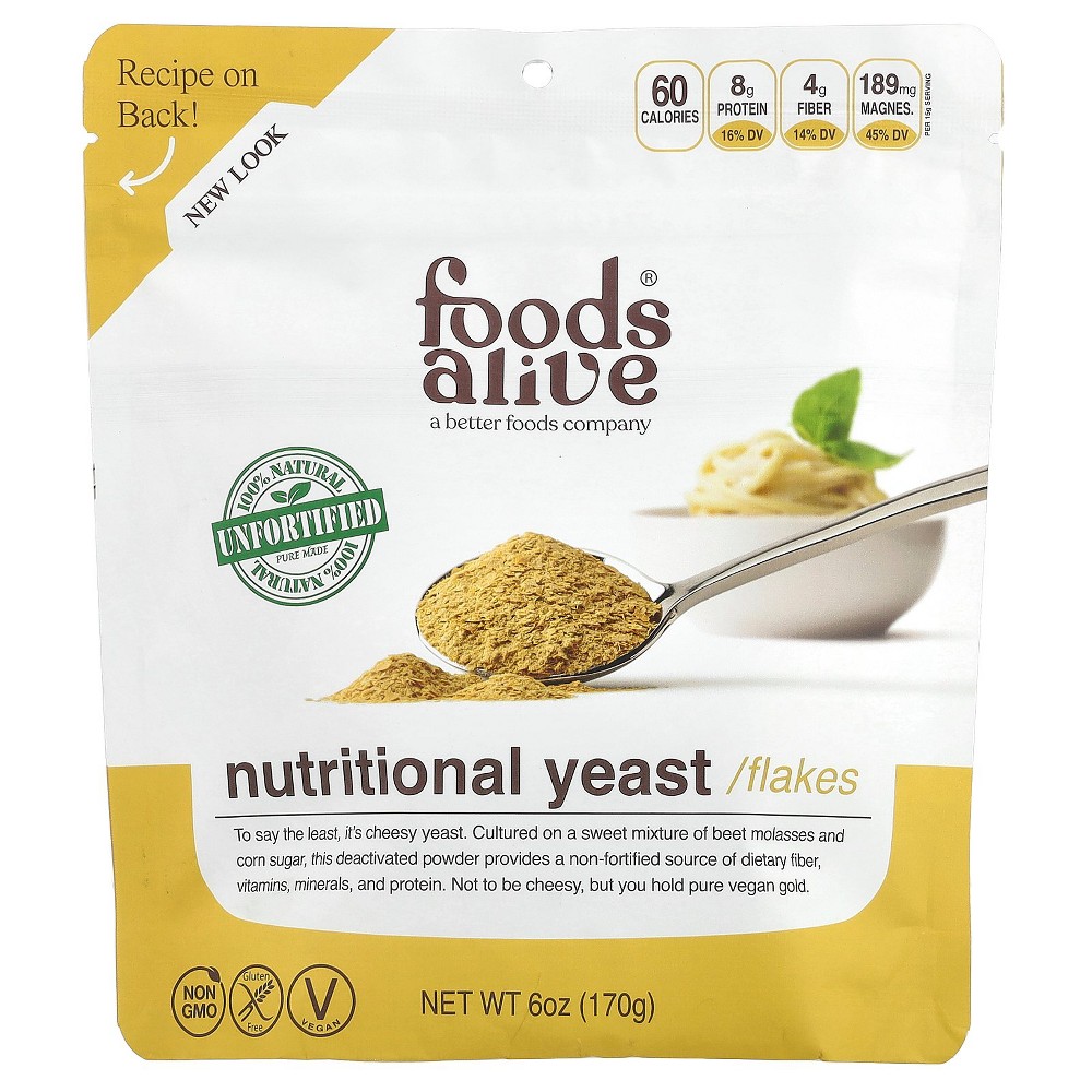 A Better Foods Company 100% Natural - Unfortified - Pure Made Non GMO Gluten Free Vegan Kosher Per 15 g Serving 60 Calories 8 g Protein - 16% DV 4 g Fiber - 14% DV 189 mg Magnes. - 45% DV Nutritional Yeast / Flakes To say the least, it's cheesy yeast. Cultured on a sweet mixture of beet molasses and corn sugar, this deactivated powder provides a non-fortified source of dietary fiber, vitamins, minerals, and protein. Not to be cheesy, but you hold pure vegan gold. Foods Alive is a family-company, crafting healthy foods since 1999. Just like you, we strive for the optimal health and well-being of our loved ones, which is why you will find only the highest-quality ingredients in the foods we make. From our family to yours, may you have health, wealth, and happiness.