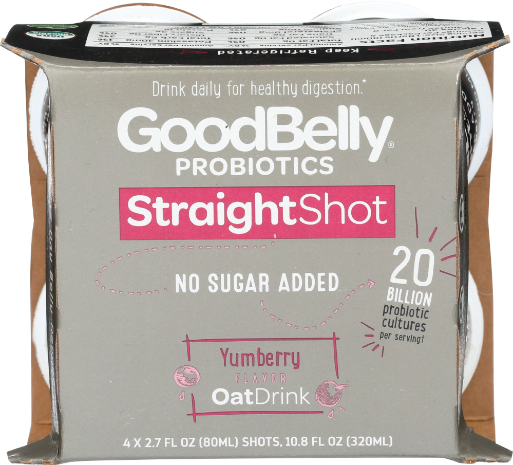 Oat Drink. Dairy-free. USDA Organic. Certified Organic by Quality Assurance International (QAI). Vegan. No added sugar. Non-GMO. Digestive health made simple. Made with probi digestis. 20 billion probiotic cultures (Per serving at time of manufacture. Storage conditions may affect the number of active probiotic cultures. Please keep at 35-40 degrees F for maximum potency). What's GoodBelly StraightShot? GoodBelly StraightShot is a gently flavored, dairy-free probiotic shot with 20 billion live and active cultures per serving and no sugar added. It's created to naturally renew your digestive health, right where your overall health gets started - in your belly (Lactobacillus plantarum 299v can be found naturally in the intestinal system, and may help promote healthy digestion when consumed daily as part of a nutritious diet and healthy lifestyle. GoodBelly is a food product and not a treatment or cure for any medical disorder or disease. If you have any concerns about your digestive system, please consult your healthcare professional). See inside for more info! www.goodbelly.com. probi.com. Got Questions? Contact us at info(at)goodbelly.com. www.goodbelly.com. Do the 12 day belly reboot (see bottom for details).