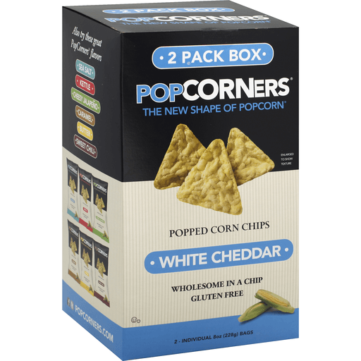 2 pack box. 2 individual bags. The new shape of popcorn. Wholesome in a chip. Gluten free. popcorners.com. PopCorners are the delicious new snack with the snap of a chip and the same wholesome goodness as popcorn. They're air popped with real corn so you can snack smart. Enjoy them alone or with your favorite dips. Made in USA.